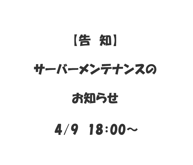 4/8 18:00 ~ 4/9 6:00上記期間、サーバーメンテナンスを行います。表示が崩...