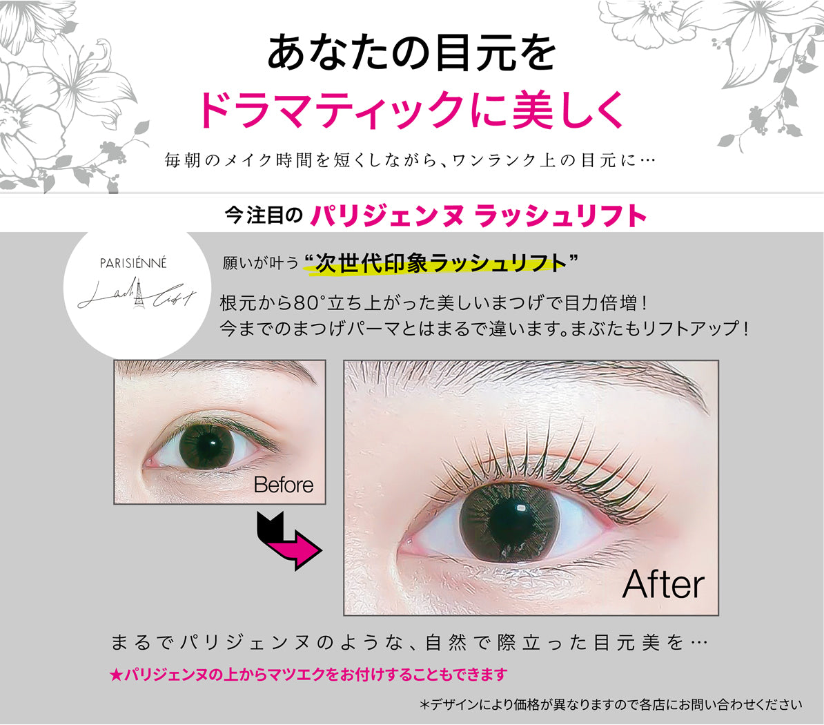 パリジェンヌラッシュリフト・・・まつ毛を根元からぐっと立ち上げ、長さを最大限に生かすまつ毛パーマ。ケアトリートメント込みでダメージを抑えます。
